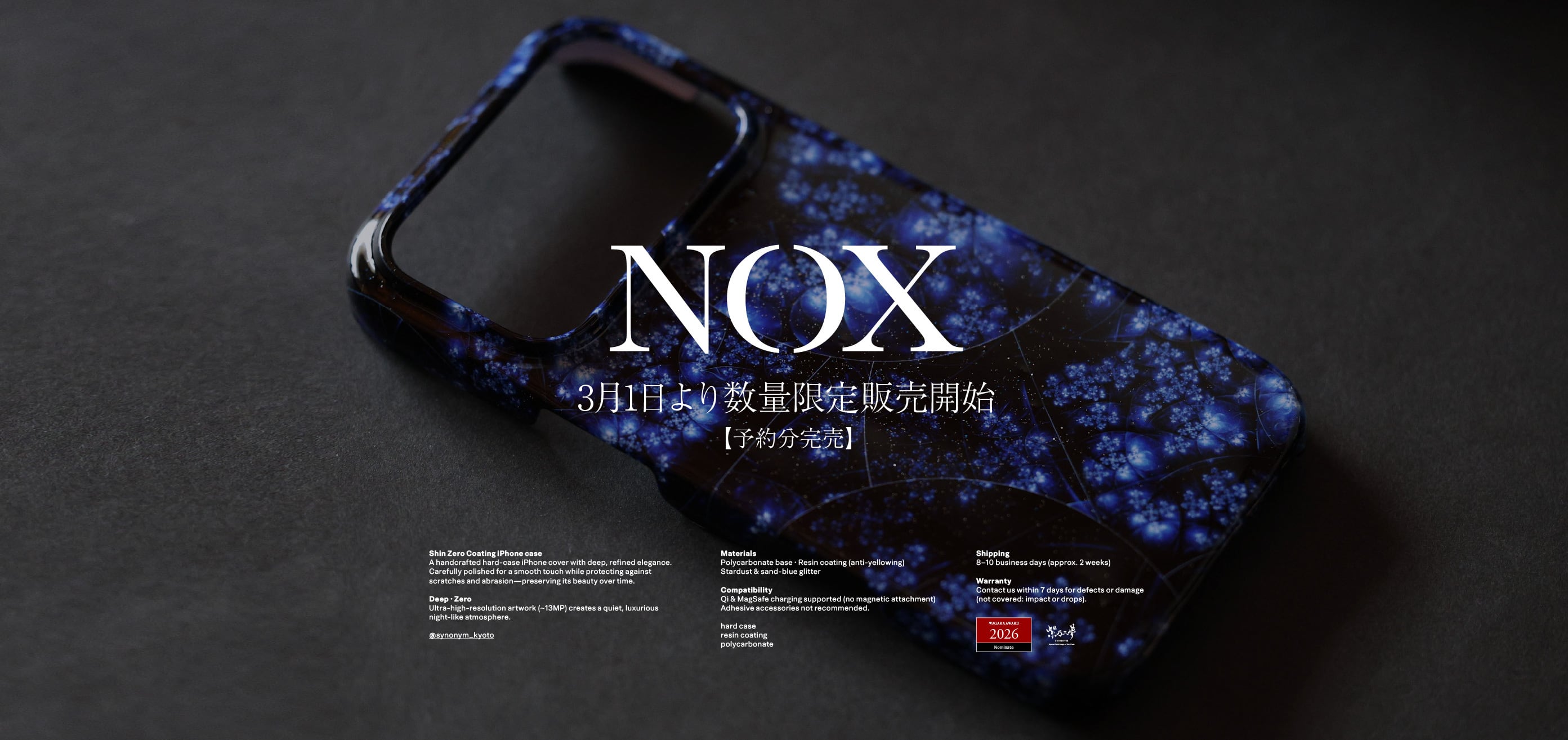 紫乃二夢 オリジナルコーティング iPhoneケース。 NOX(夜)の美しさを閉じ込めた、 漆のような手作業仕上げ。 光を受けて静かに艶めき、 目を奪う華やかさへ。 3個に1個しか完成しない 唯一無二の和柄ケース。