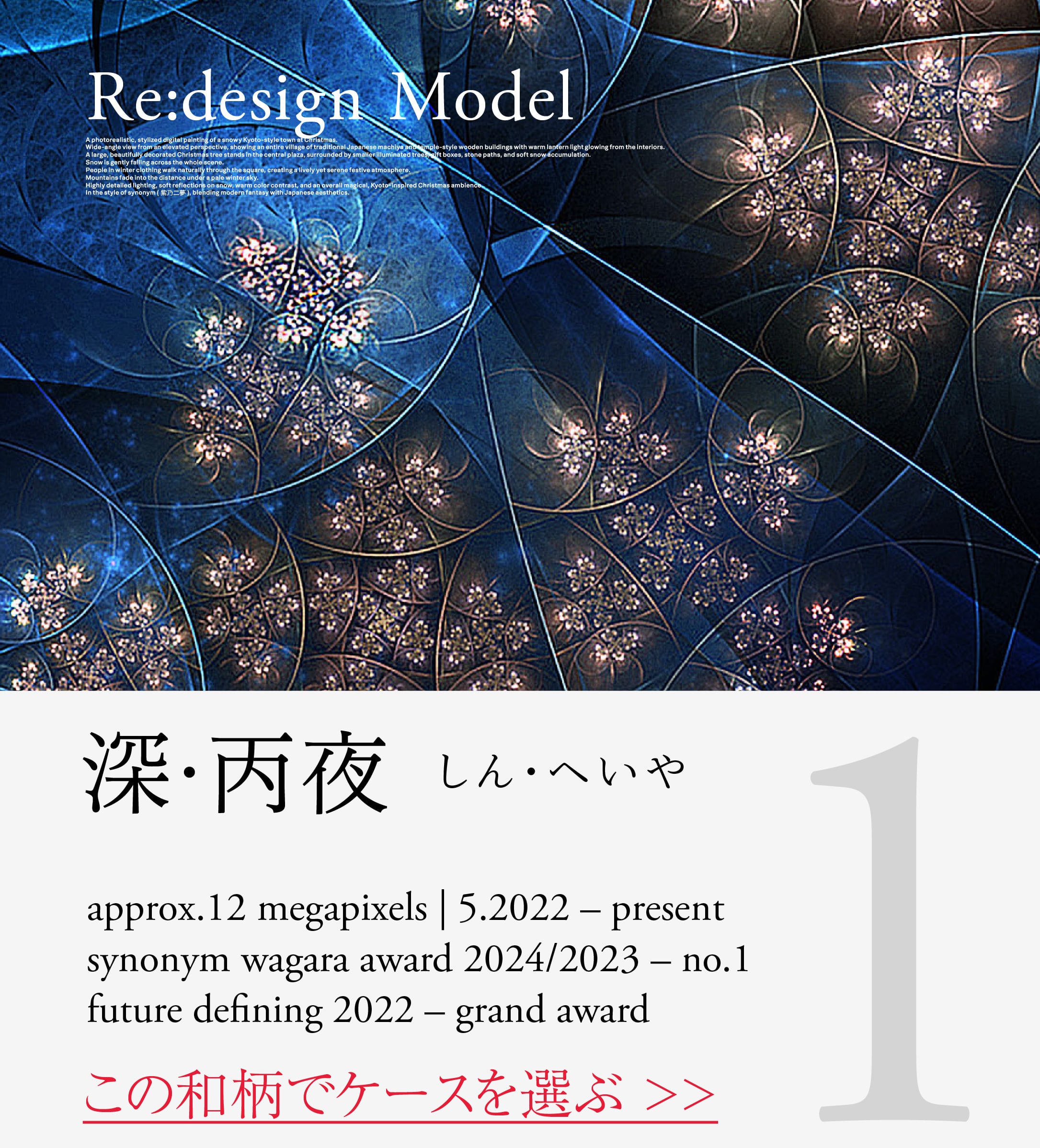紫乃二夢のつくる和柄コンセプトは「進化」。 和風の感覚的要素と、フラクタルの数学的要素をデザイナーの腕で合わせた超難易度作品。日本の和を現代的に作り直した唯一無二の作品。桜や紅葉、夜空をモチーフに、繊細で緻密な構成が生む奥行きのある美しさ。手にするたび、新たな表情を楽しめる作品です。