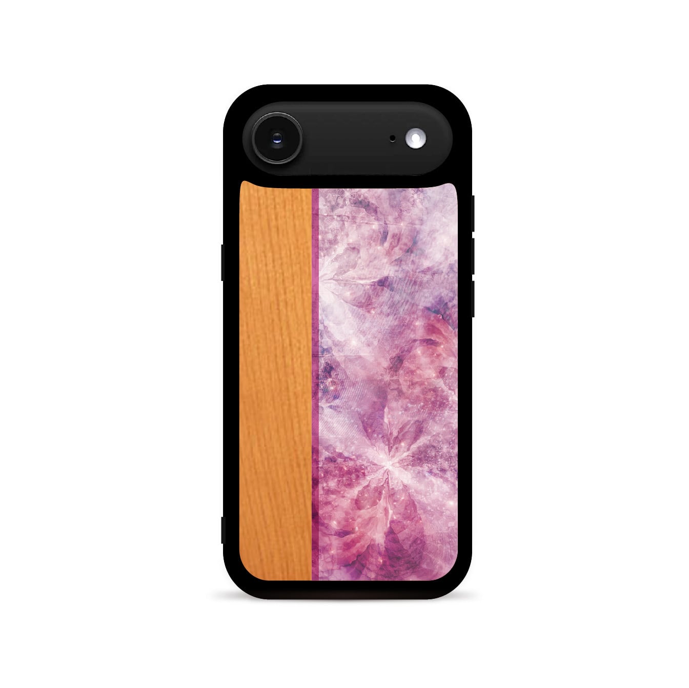 天然木のチェリーウッドを使用してリデザイン結・麗咲(ゆいれいしょう)を取り入れた和風 モダンウッド iPhoneケースです。内側と側面は硬質ブラックラバー。紫乃二夢の和柄と桜の木で和モダンな雰囲気をお楽しみいただけます。
