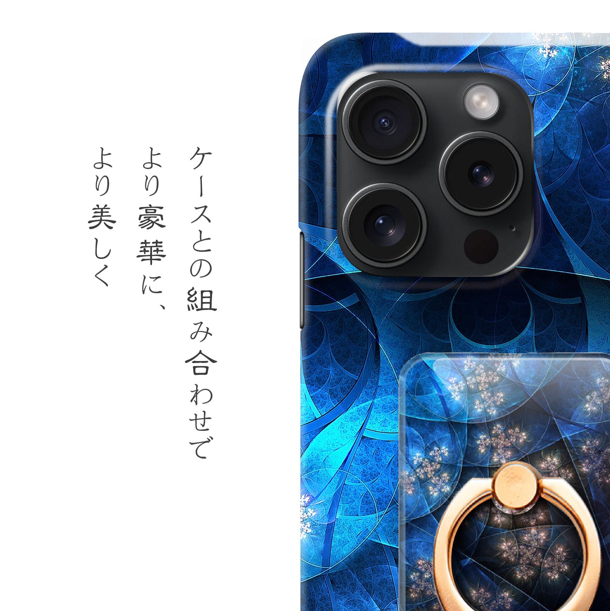 装着は両面接着シート(付属)でしっかり固定し、ハードケースの上から付ける事はもちろん、ガラス製の背面機種を除き、本体への直付けも可能。リングとケースのデザインを合わせると、立体感のあるワンランク上のスマホアクセサリーへと進化します。