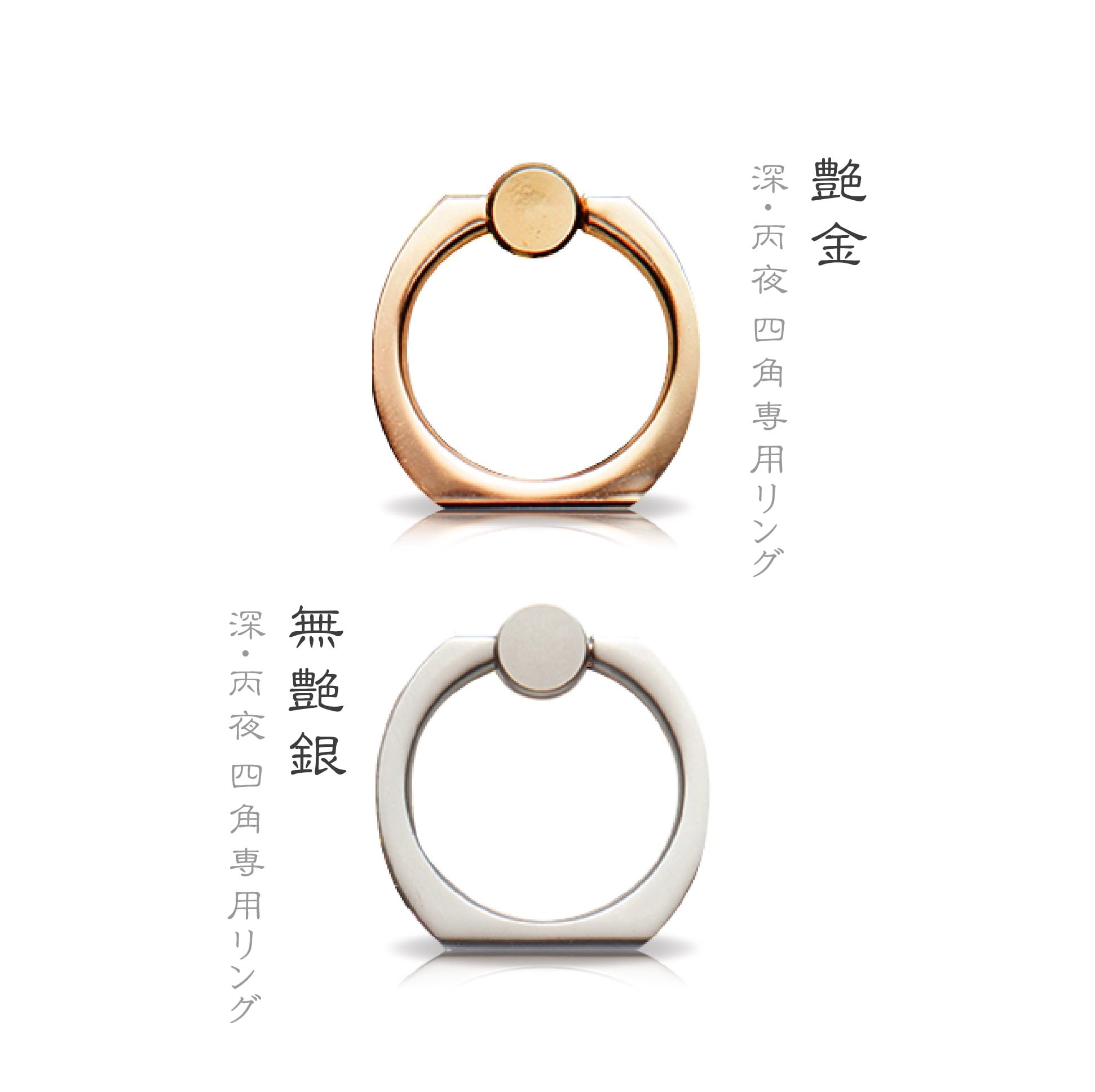 四角型で金と艶無銀の2種類からお選びいただけます。リングに指を引っ掛ける事で本体落下防止の安全面を推したプロダクトです。
