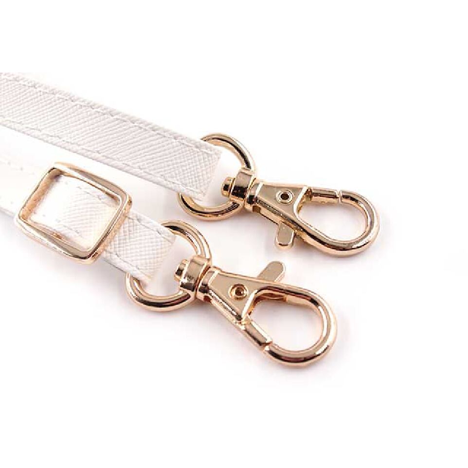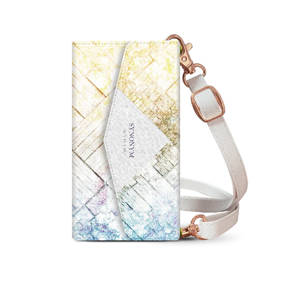ホワイトハンドストラップも付属。家事や仕事の間、スマホを無くさないように首や肩からブラ下げるのに非常に便利です。金具はゴールドで統一しており、ケースと同じ素材で作られているので非常にハイクオリティなディテールとなっております。