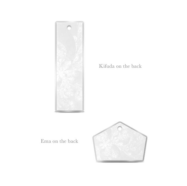 紅褄(べにつま)和柄の和風アクリルストラップ。透明度に優れたアクリル素材は紫乃二夢の繊細な和柄をさらに美しく表現。コンパクトな上に、およそ8mmの厚さによる奥行きと立体感が、和柄の美しさをより引き出します。木札型と絵馬型の2種類から選べる縁起物。お守りをお洒落に持ちたい方にも最適です。