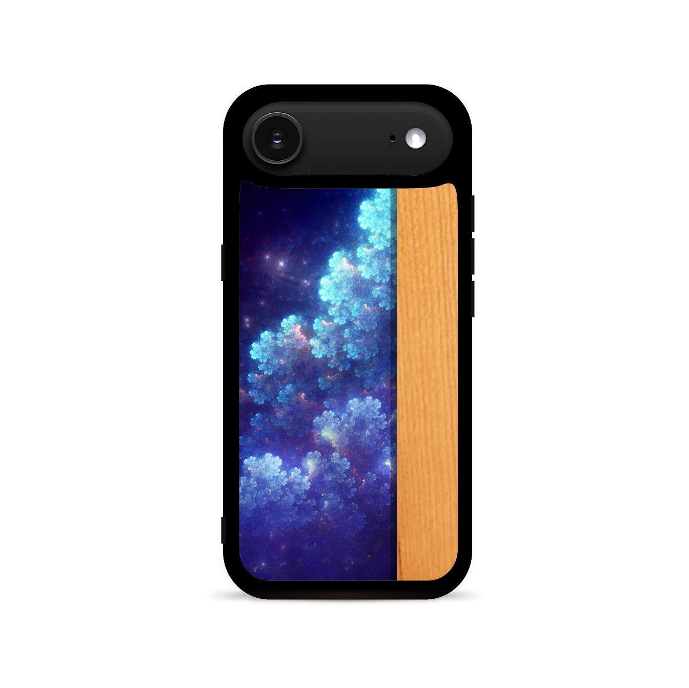 天然木のチェリーウッドを使用した青藍(せいらん)の和風 モダンウッド iPhoneケース【23-24AW】です。内側と側面は硬質ブラックラバー。紫乃二夢の和柄と桜の木で和モダンな雰囲気をお楽しみいただけます。