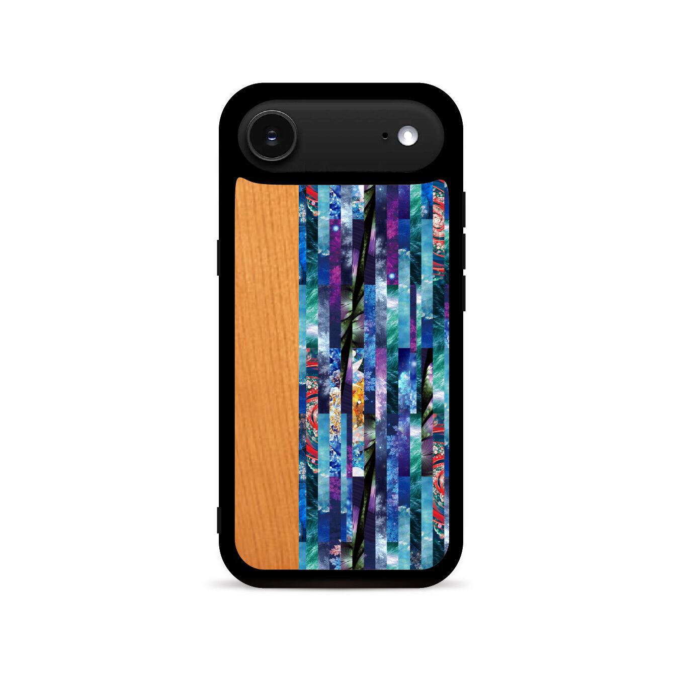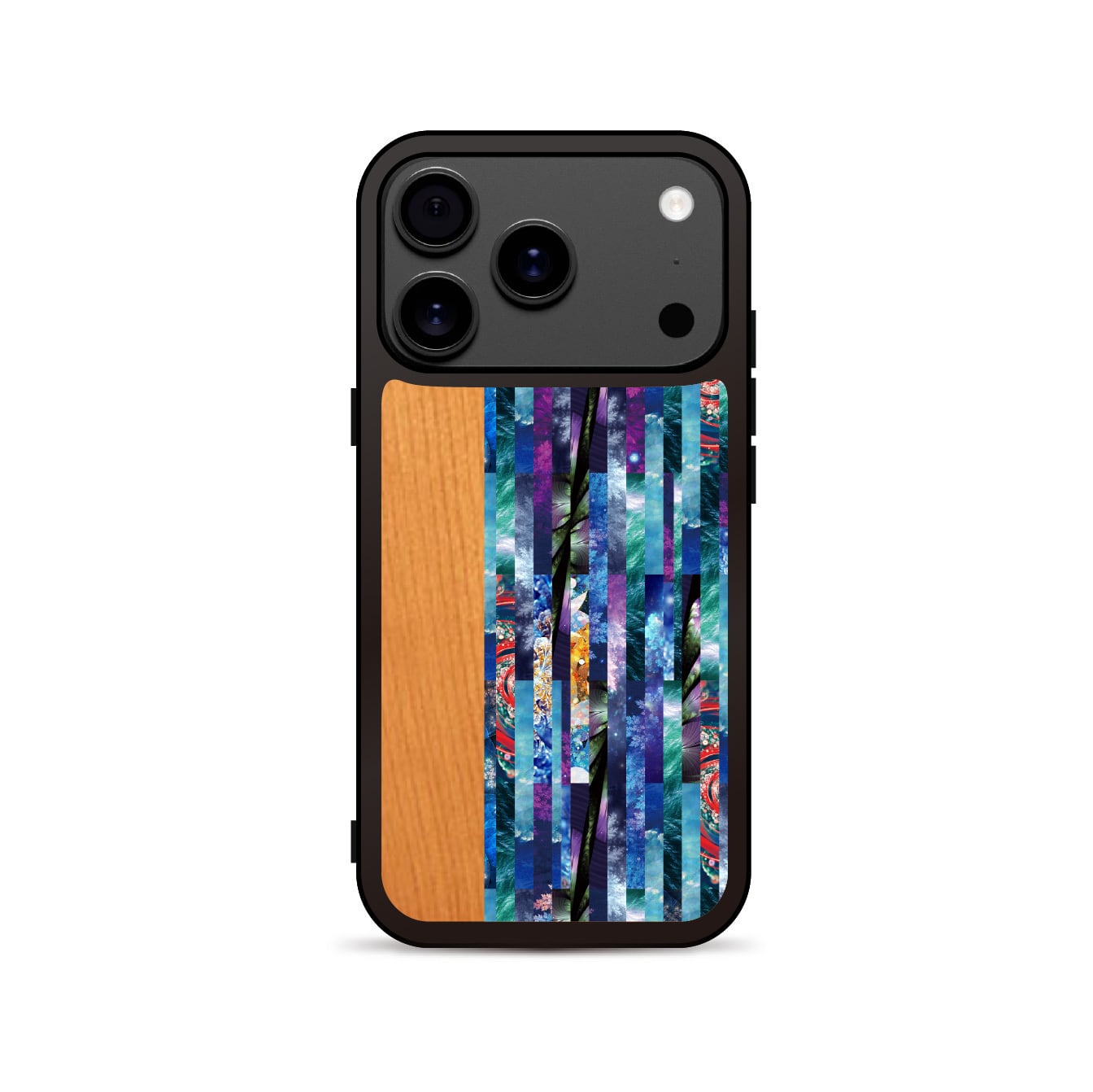 天然木のチェリーウッドを使用し、十二単(じゅうにひとえ)をイメージした蒼一式のベスト盤青和柄集合デザイン。その和風 モダンウッド iPhoneケース【25SS】です。内側と側面は硬質ブラックラバー。紫乃二夢の和柄と桜の木で和モダンな雰囲気をお楽しみいただけます。