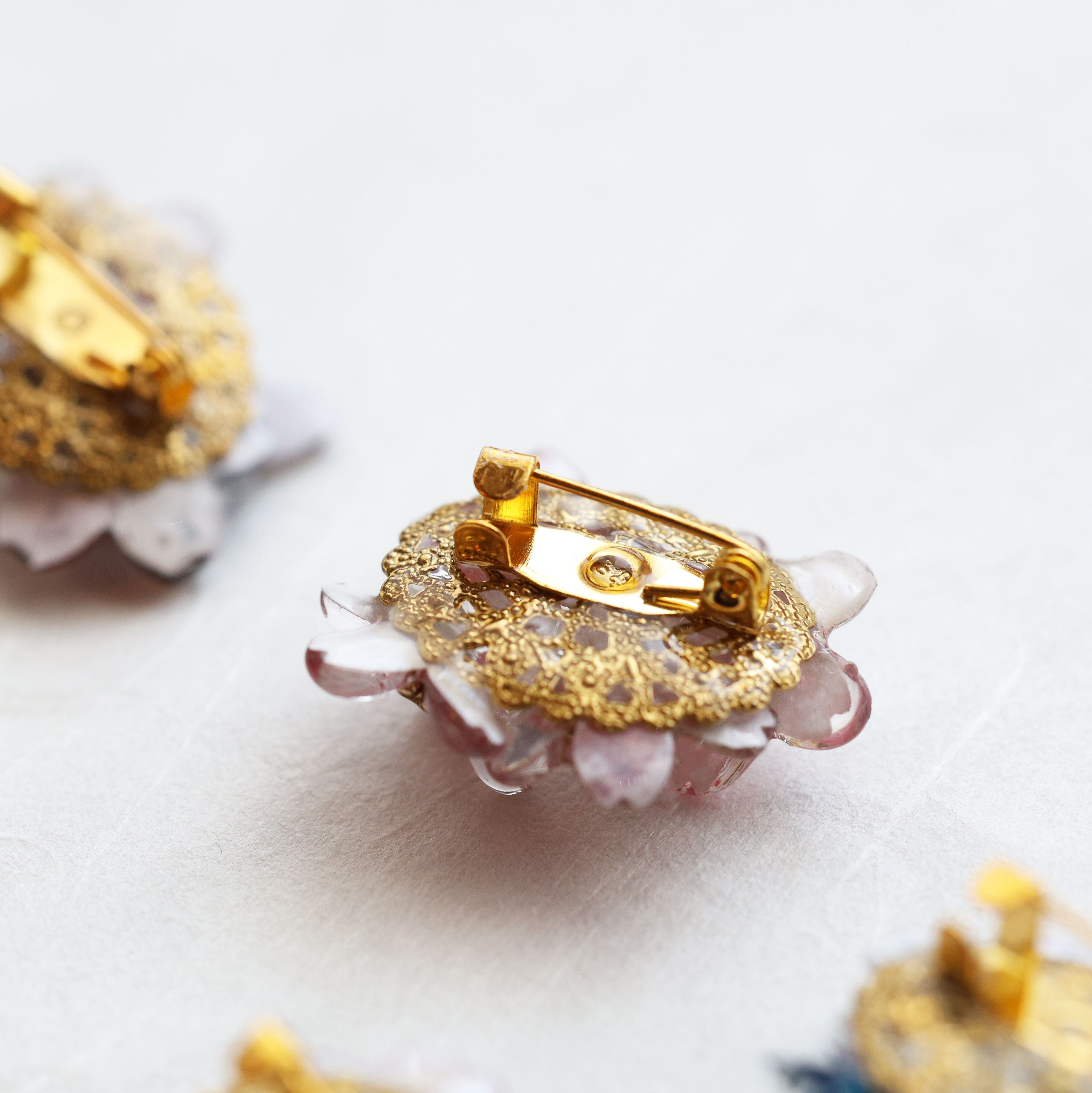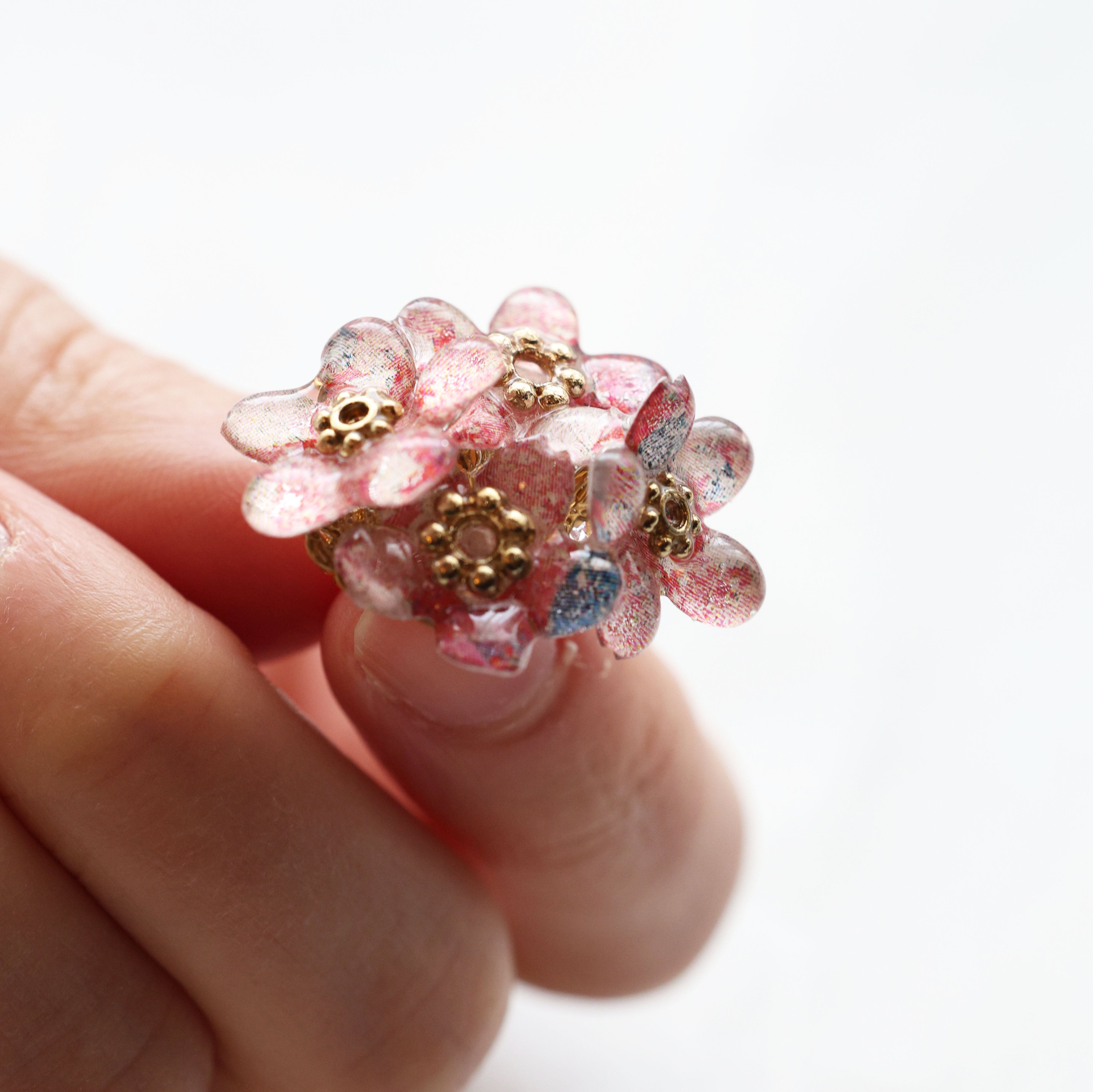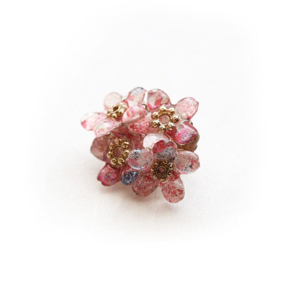 和柄の繊細な模様がレジンの透明感と相まって、光を受けるたびに華やかに輝きます。花の形状はぷっくりと可愛らしく、どこか懐かしさと温かみを感じさせ、日常のコーディネートにぴったりのアクセントとなるでしょう。